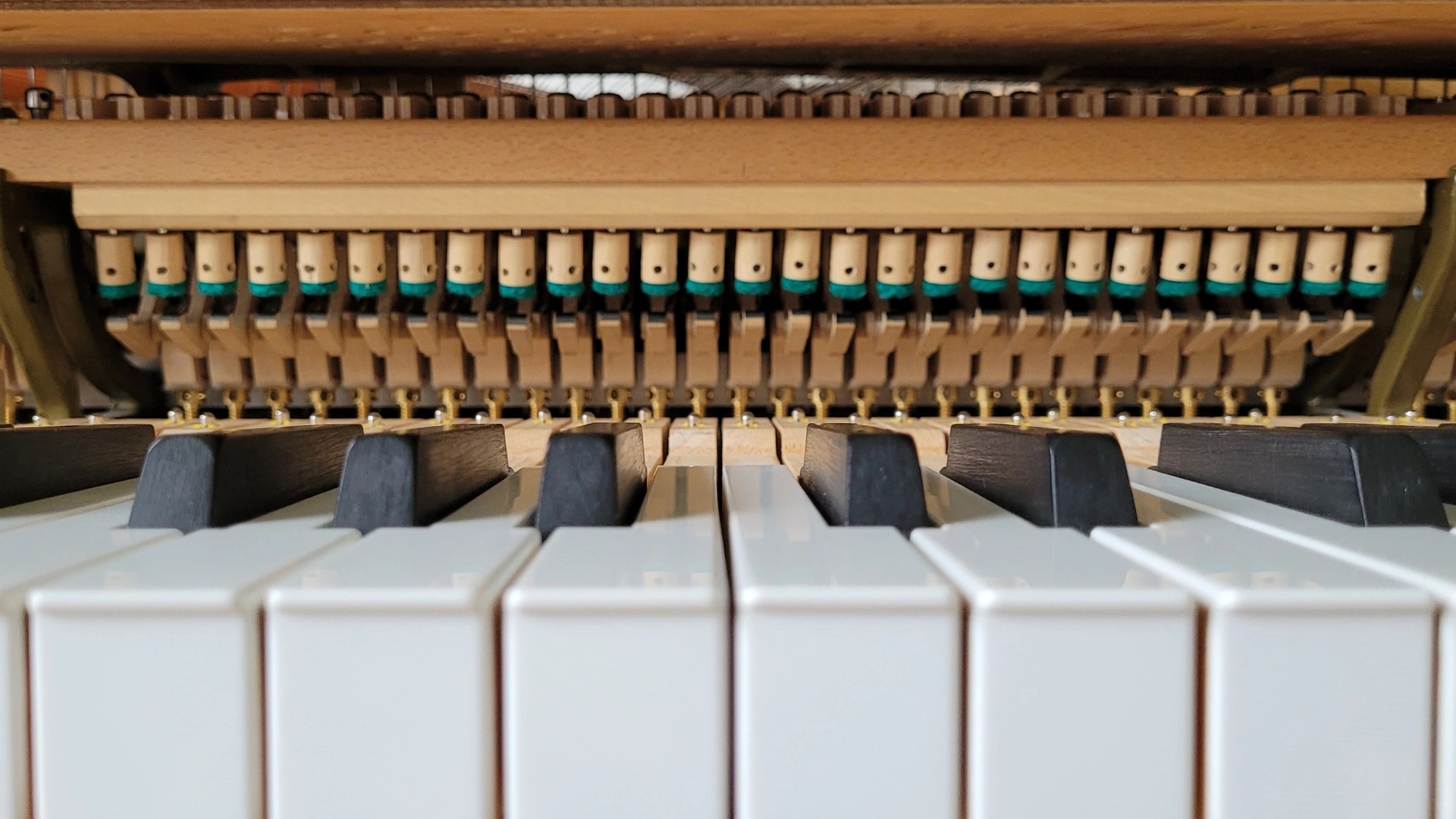 Les mortaises guident les touches du piano. Au fil du temps, les garnitures en feutre présentent sur ces mortaises s’usent sous l’effet des frottements répétés. D’abord, un jeu latéral apparaît, réduisant la précision du clavier. Progressivement, des bruits parasites comme des claquements se manifestent, altérant le confort de jeu. Pour restaurer la précision et le silence du clavier, l’accordeur remplace donc les 352 garnitures de mortaises une à une. Cette intervention redonne au pianiste une sensation de jeu fluide et agréable.